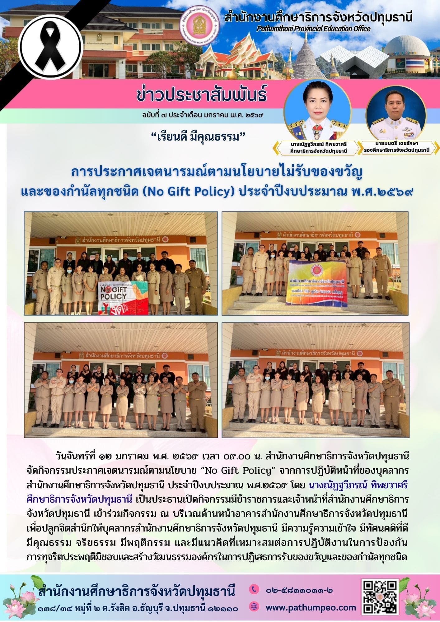 การประกาศเจตนารมณ์ตามนโยบายไม่รับของขวัญและของกำนัลทุกชนิด (No Gift Policy) ประจำปีงบประมาณ พ.ศ.๒๕๖๙