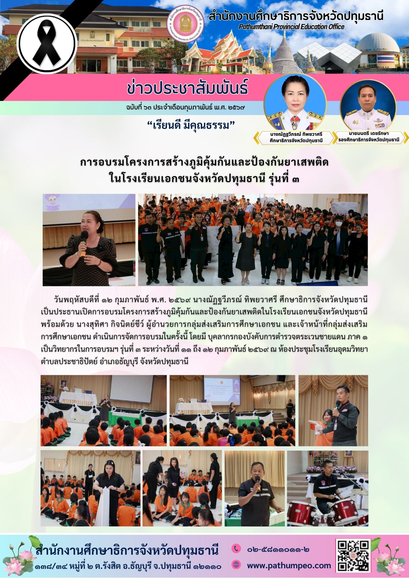 การอบรมโครงการสร้างภูมิคุ้มกันและป้องกันยาเสพติด ในโรงเรียนเอกชนจังหวัดปทุมธานี รุ่นที่ ๓