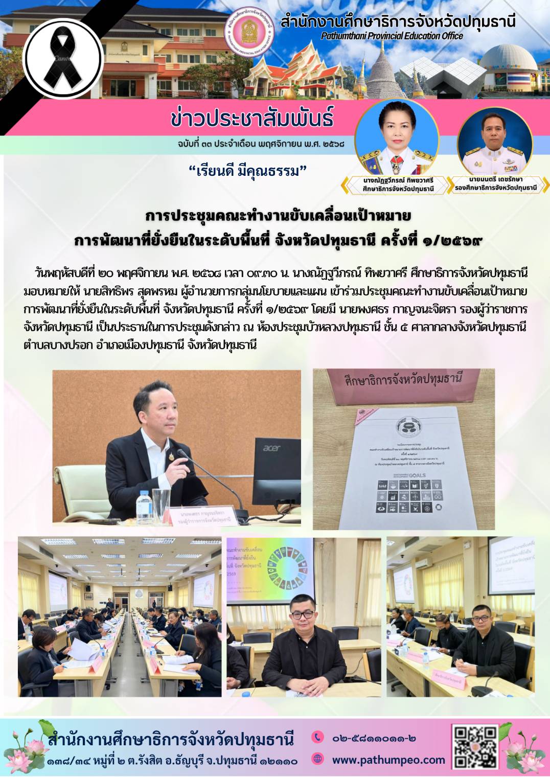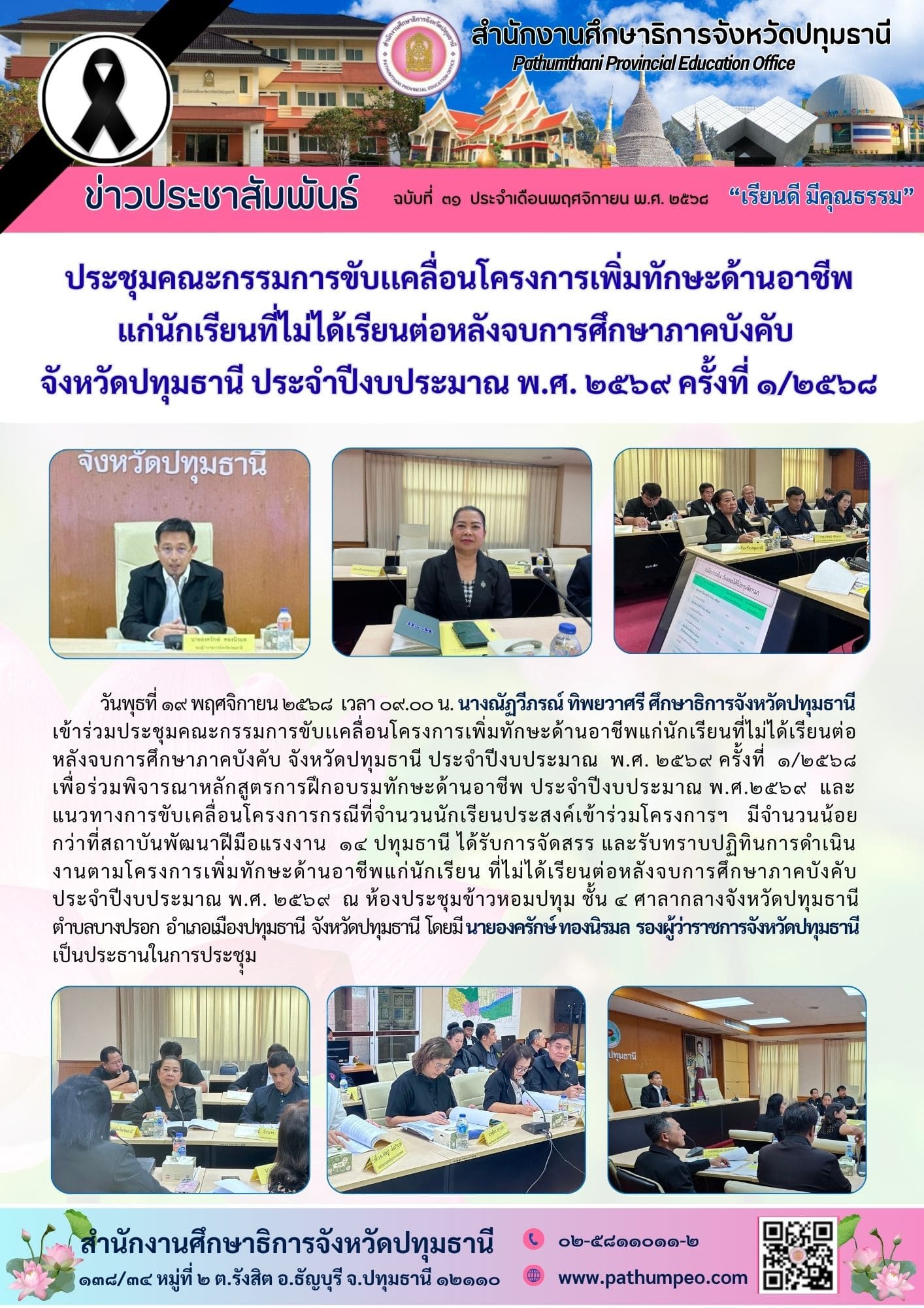 ประชุมคณะกรรมการขับเเคลื่อนโครงการเพิ่มทักษะด้านอาชีพ แก่นักเรียนที่ไม่ได้เรียนต่อหลังจบการศึกษาภาคบังคับ จังหวัดปทุมธานี ประจำปีงบประมาณ พ.ศ. ๒๕๖๙ ครั้งที่ ๑/๒๕๖๘