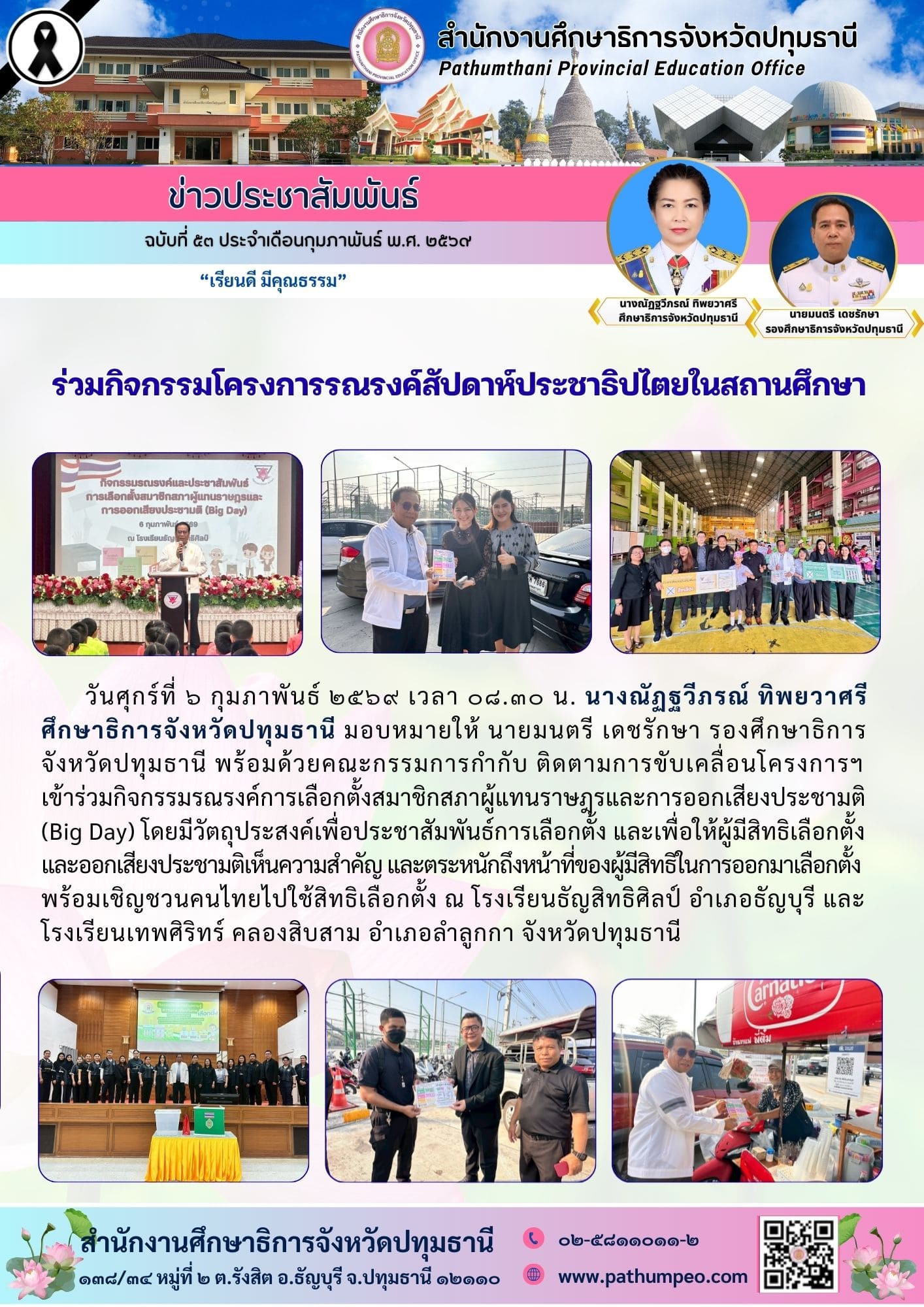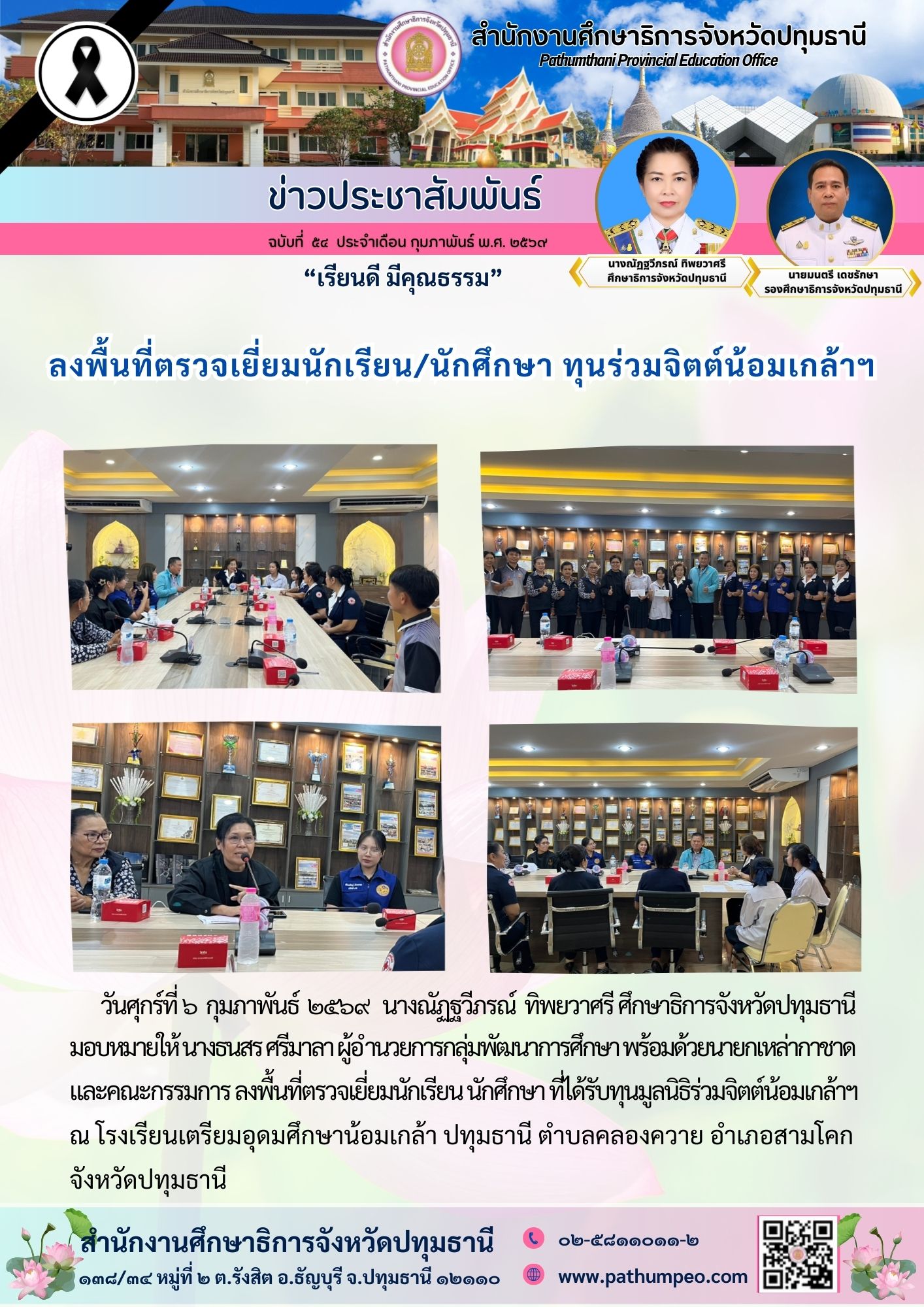 ประธานคณะกรรมการ กศจ. ลงพื้นที่ติดตามผลการขับเคลื่อน โครงการขับเคลื่อนการยกระดับคุณภาพการศึกษา และประสิทธิภาพการศึกษาจังหวัดปทุมธานี ผ่านกลไก กศจ. ประจำปีงบประมาณ พ.ศ. ๒๕๖๙ ครั้งที่ ๒ (โรงเรียนวัดบางคูวัด)