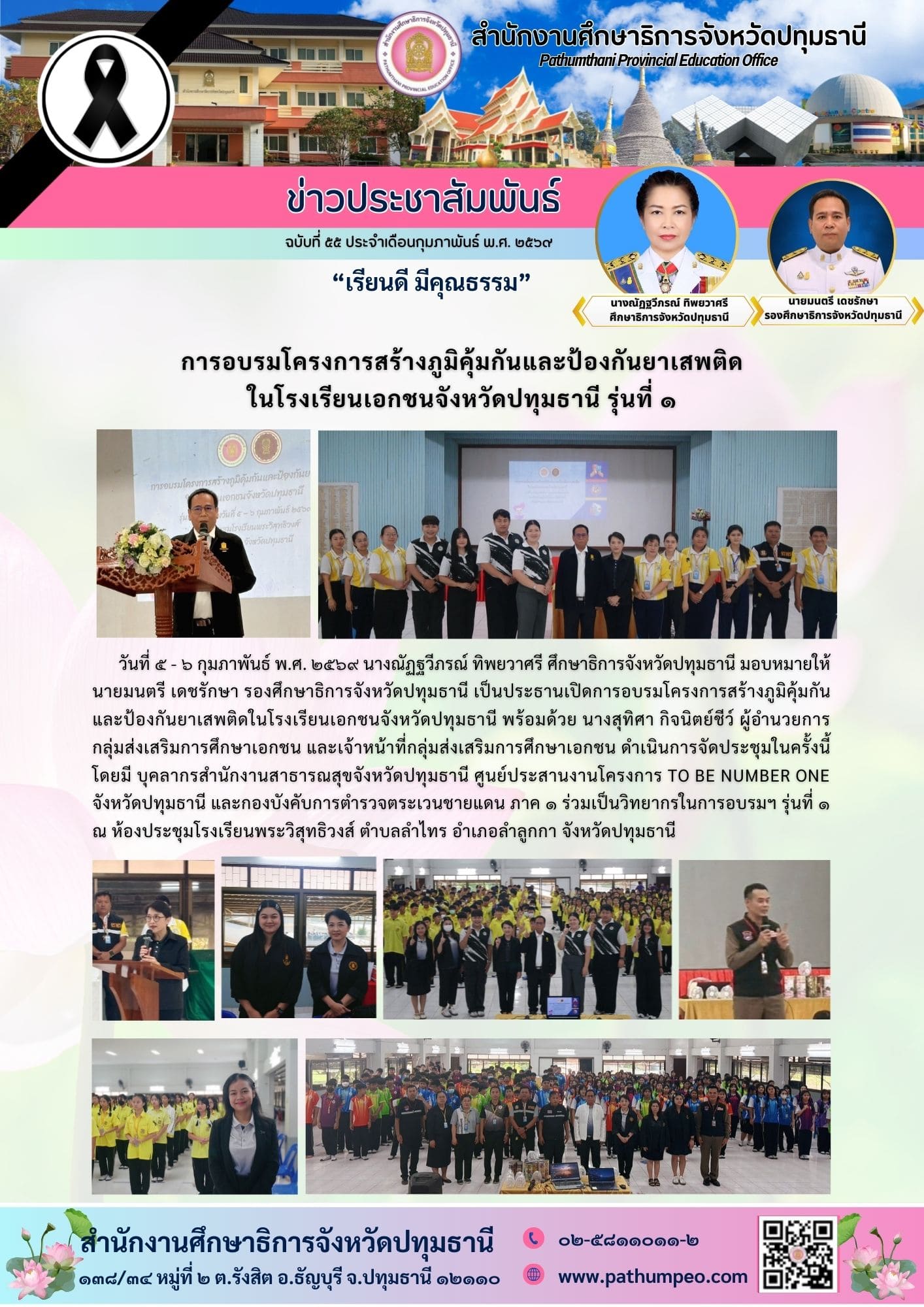การอบรมโครงการสร้างภูมิคุ้มกันและป้องกันยาเสพติด ในโรงเรียนเอกชนจังหวัดปทุมธานี รุ่นที่ ๑