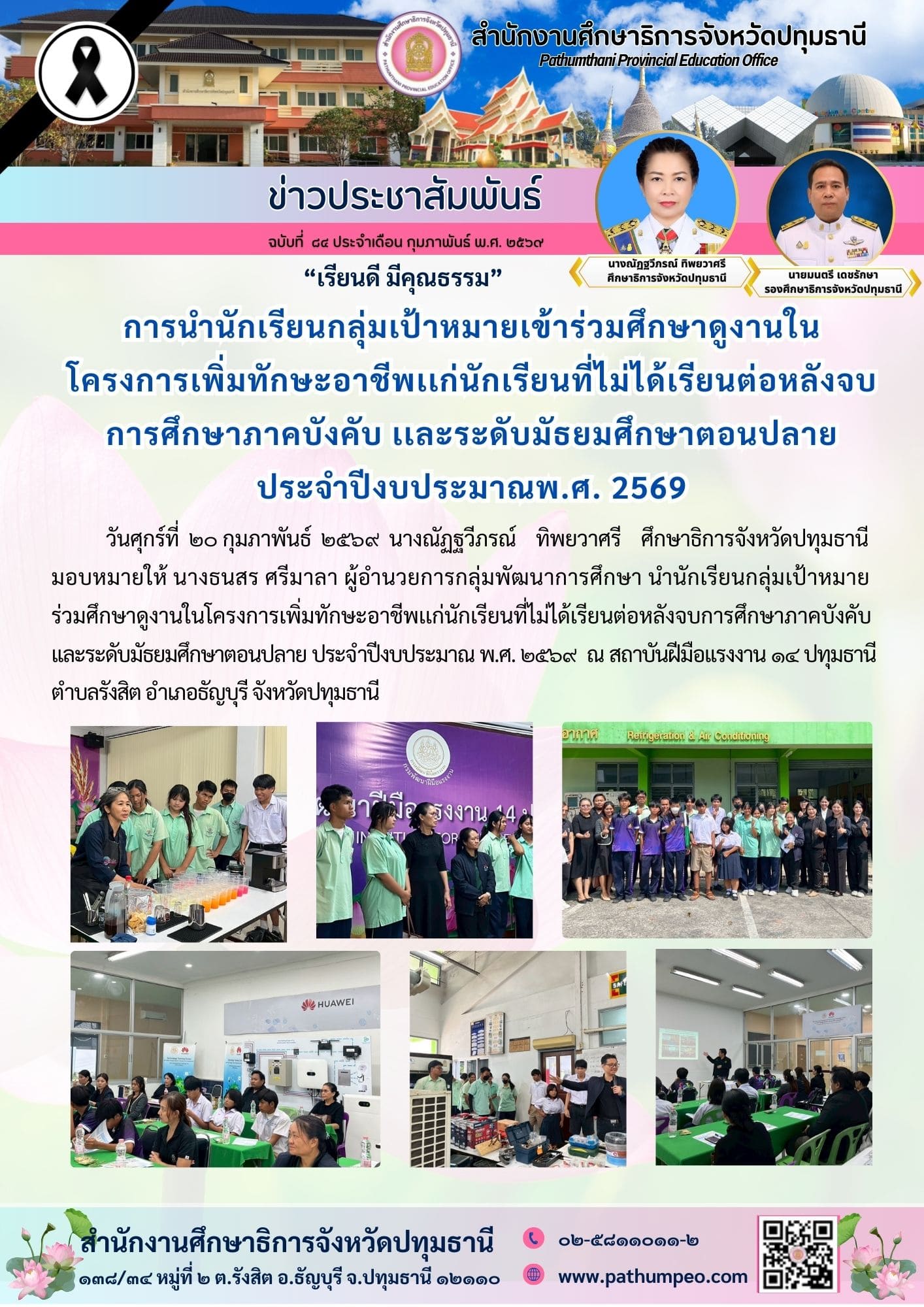 การนำนักเรียนกลุ่มเป้าหมายเข้าร่วมศึกษาดูงานในโครงการเพิ่มทักษะอาชีพเเก่นักเรียนที่ไม่ได้เรียนต่อหลังจบการศึกษาภาคบังคับ เเละระดับ มัธยมศึกษาตอนปลายประจำปีงบประมาณพ.ศ. ๒๕๖๙