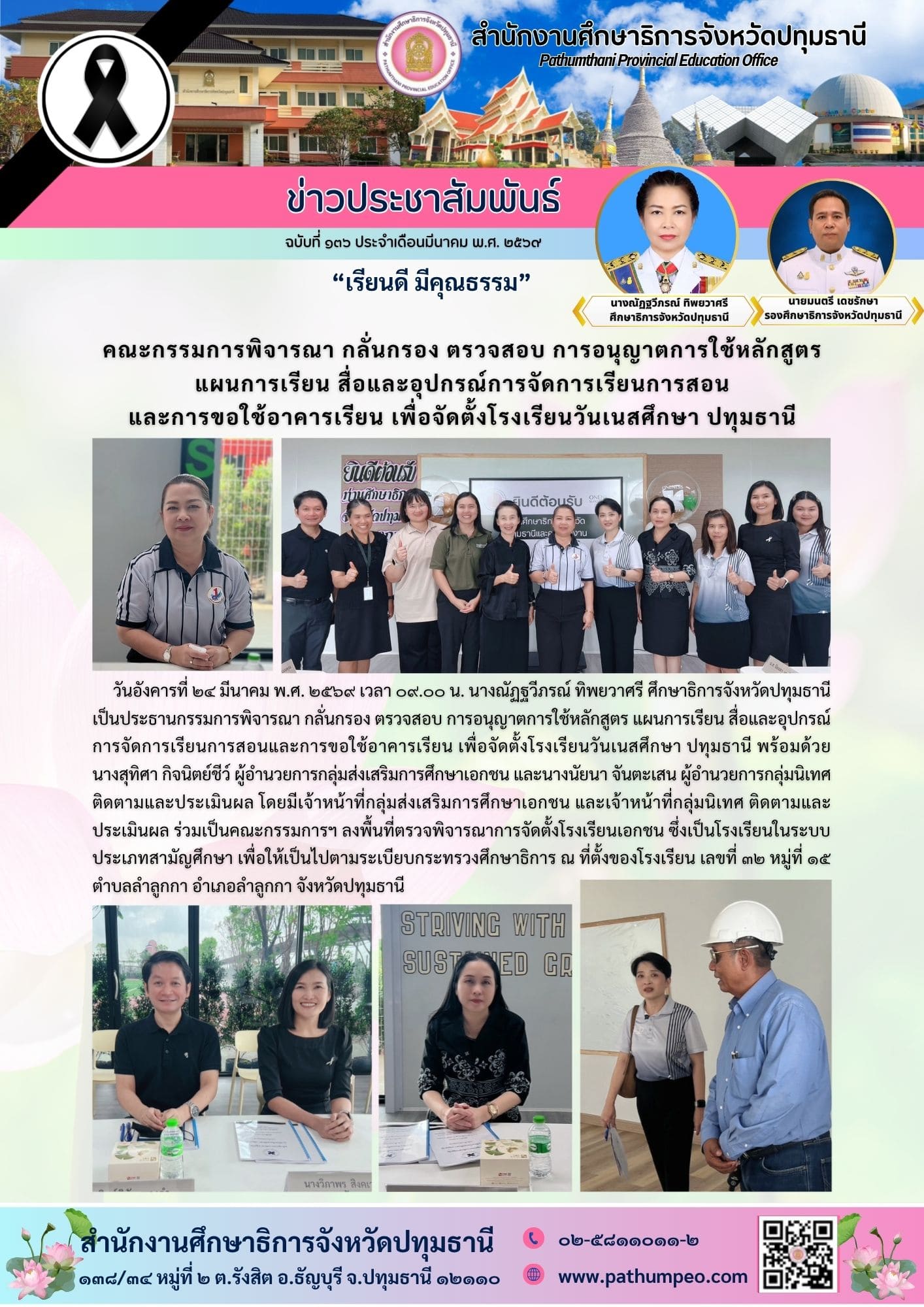 คณะกรรมการพิจารณา กลั่นกรอง ตรวจสอบ การอนุญาตการใช้หลักสูตร แผนการเรียน สื่อและอุปกรณ์การจัดการเรียนการสอนและการขอใช้อาคารเรียน เพื่อจัดตั้งโรงเรียนวันเนสศึกษา ปทุมธานี