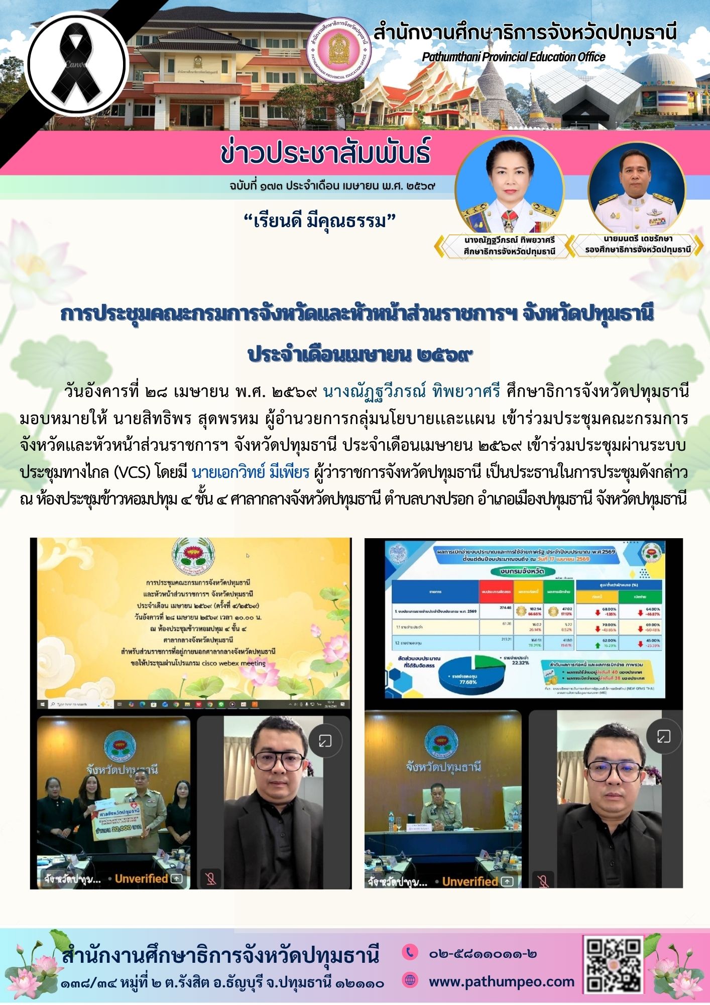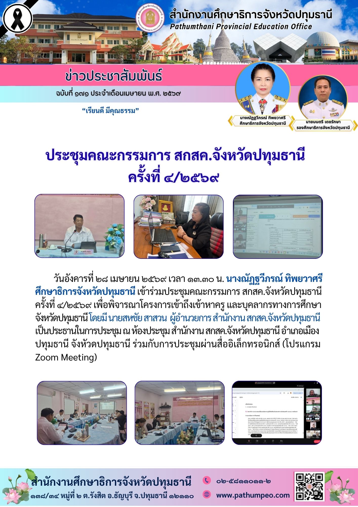 ประชุมบุคลากร สำนักงานศึกษาธิการจังหวัดปทุมธานี ประจำเดือนเมษายน พ.ศ. ๒๕๖๙ (ครั้งที่ ๔/๒๔๖๙)