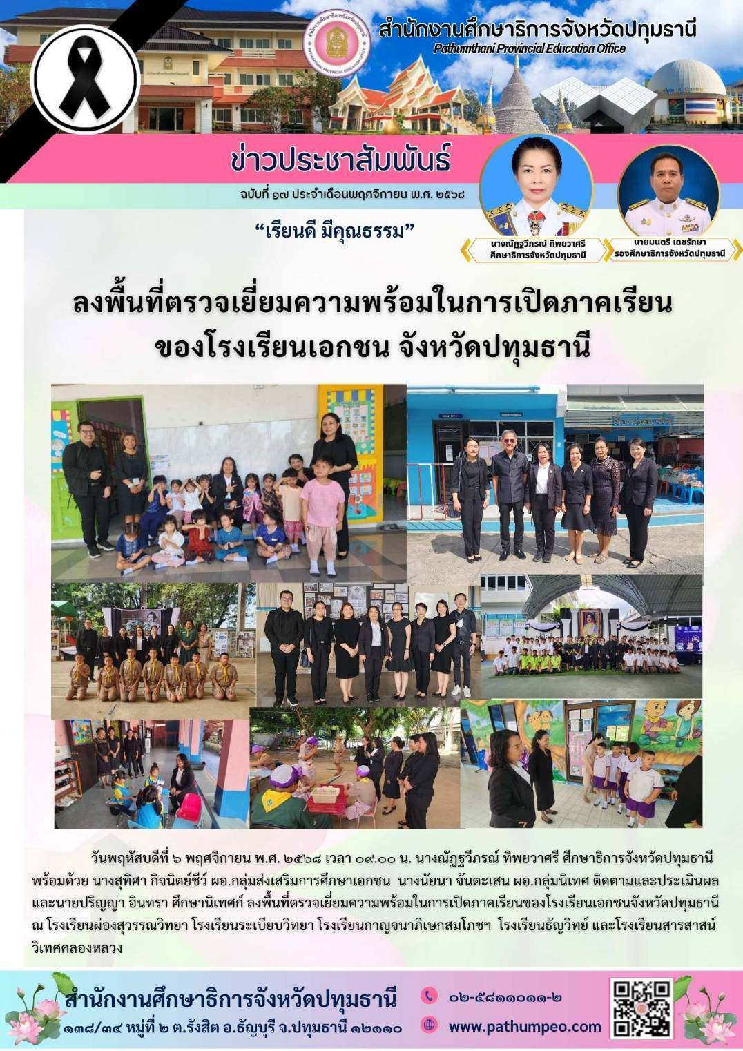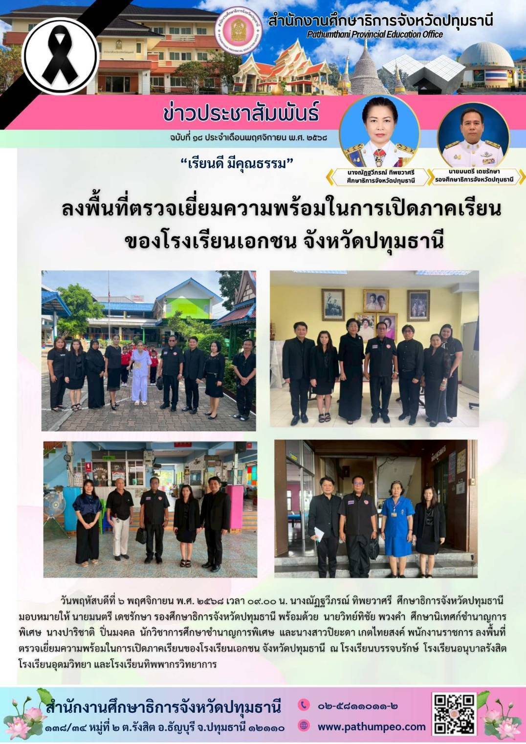 ลงพื้นที่ตรวจเยี่ยมความพร้อมในการเปิดภาคเรียน ของโรงเรียนเอกชน จังหวัดปทุมธานี ณ โรงเรียนผ่องสุวรรณวิทยา โรงเรียนระเบียนวิทยา โรงเรียนกาญจนาภิเษกสมโภชฯ โรงเรียนธัญวิทย์ และโรงเรียนสารสาสน์วิเทศคลองหลวง